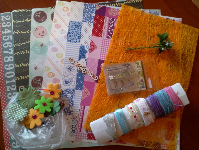 Описание:бумага для скрапбукинга плотная-5 листов 30Х30 (3 двусторонние,2 односторонние,картон "печворк" А4-2листа,сизаль-1шт формата А4, шнур(розовый,голубой,фиолетовый)- по 3метра, репсовая лента-2м, атласная-3отреза по 1,5метра,штампы-6шт(1 "С днём варенья"и "Школьные принадлежности 5шт.-стопка книг,рюкзак,ножницы,линейка,карандаш"), брадсы-8шт,подвески-6шт, вырубка из плотной бумаги "завитки"-2шт., цветочки на проволоке-5шт, бусины на проволоке-4шт,стразы(не считала)))), украшения(цветочки из ткани,божьи коровки и цветочки из фетра)