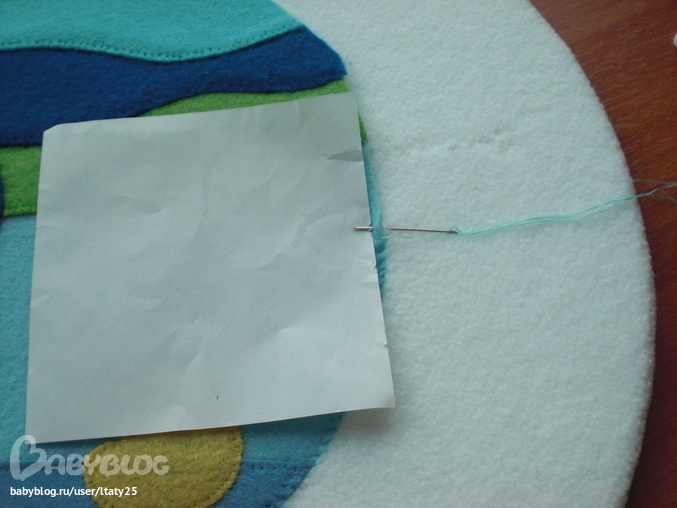 И еще для удобства нашивания внутреннего круга к основе. Я подкладывала листик бумажки, чтобы игла не цыпяла фетр.
