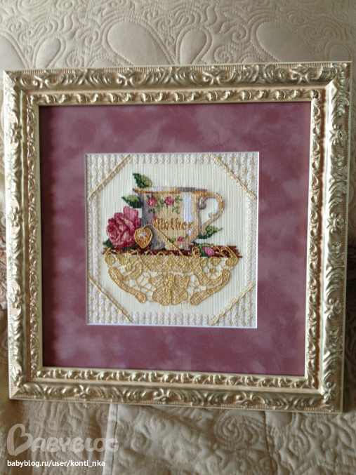 Вышивала для мамочки на ДР, набор замечательный, очень нежный и необычный. Оформляла в другой багетке (решила сменить ее) - очень понравилось, предложили бархатное паспарту и очень бытро подобрали сам багет. По-моему получилось шикаррррно))