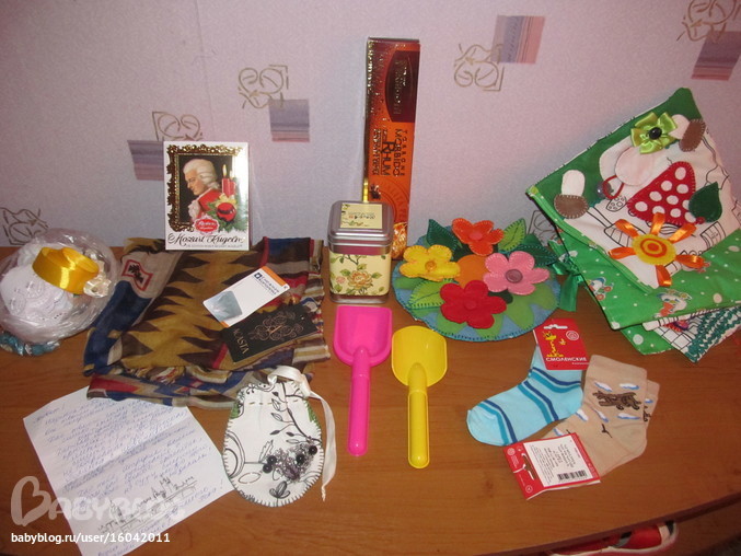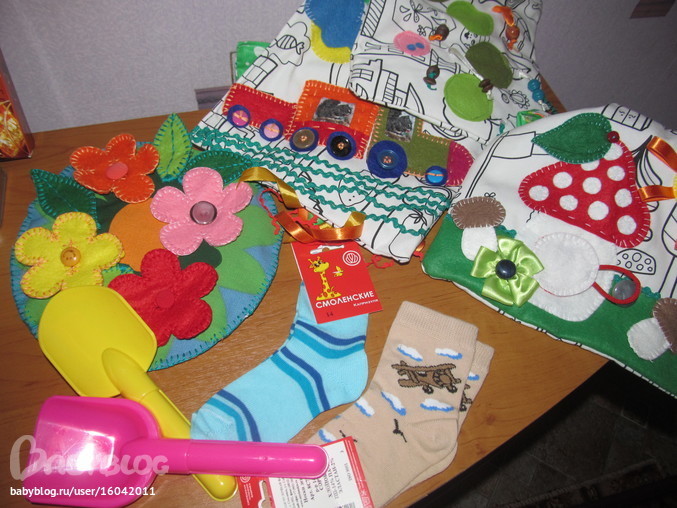 для сынульки носочки. лопатки будем летом играть)) и обалденная развивающая книжка)) все отстегивается очень интересно