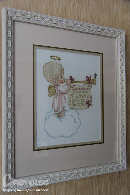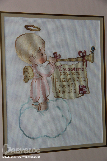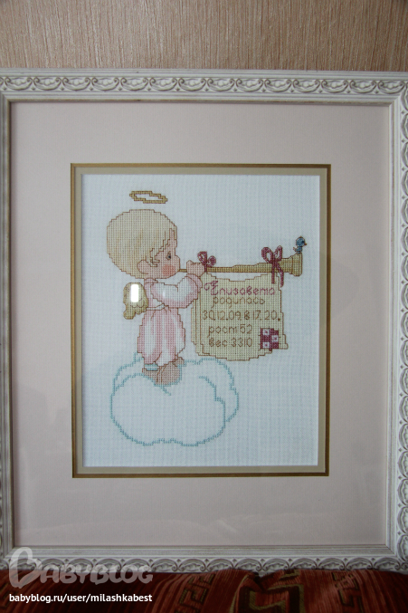 Спешу показать то немногое, что успеваю сейчас делать:) Вот за новогодние праздники вышила своей дочке метрику. По исполнению - работа несложная и оч даже простая. НО в оформленном виде - очень красивая. Чем то напоминает стиль шебби:) Рамка - натуральное дерево! И муж даже сказал, что она слишком хороша для нашей квартиры:) Сейчас он прав, но ведь скоро все измениться:) и она будет великолепно смотреться в Лизиной новой спальне. Правда?