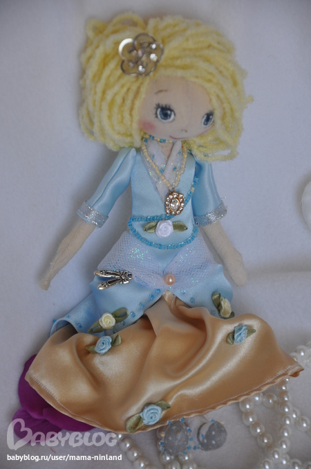 Текстильная кукла ручной работы в стиле тыквоголовка "Золушка на балу". Рост 25 см. Создана по мотивам чудесного советского мультфильма "Золушка". Ножки, ручки сгинаются в коленах и локтях, кукла сидит с опорой. На куколке золотисто-голубое атласное платье, украшенное бисером, блестящим фатином, бусинами, атласными розочками. Под платьем - хлопковая нижняя юбка, отделанная кружевом и белоснежные панталончики. Одежда не снимается.