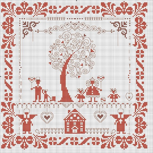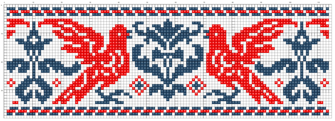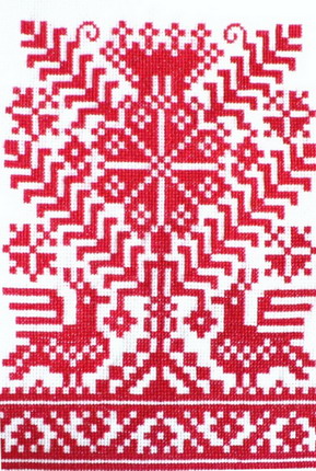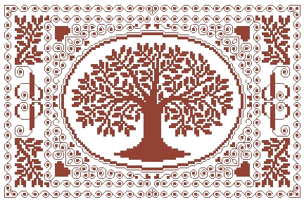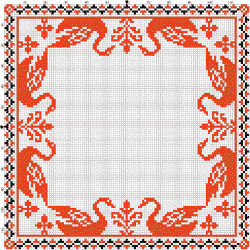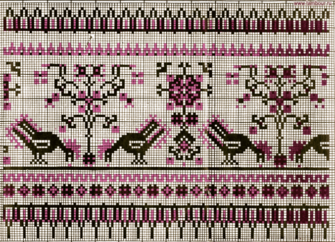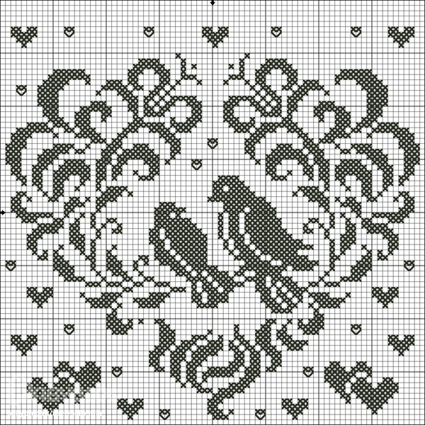 Вот есть такая схема в монохроме. Потом ещё посмотрю добавлю вам схемок. Надо вышивать пары птиц с цветочным орнаментом и древом рода(древо жизни), желательно в красном цвете. Павлины, голуби, лебеди...