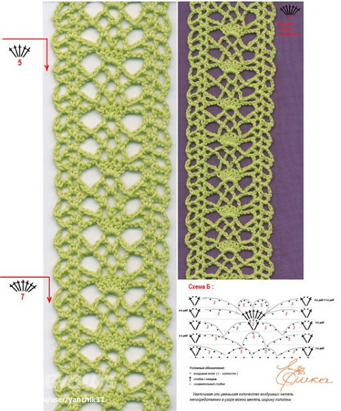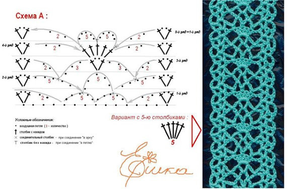 Вязала как на схеме. с одной стороны в конце ряда цепочку из воздушек вязала, а с другой стороны привязывала отдельно связаную цепочку из в п. Как у китайцев обычно это делается.