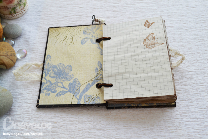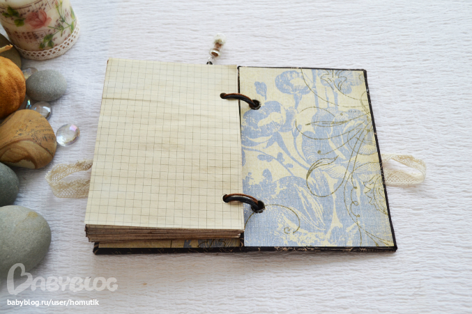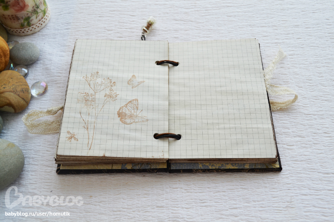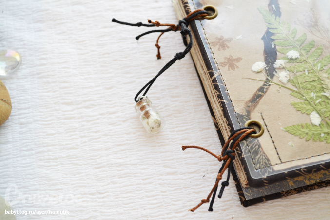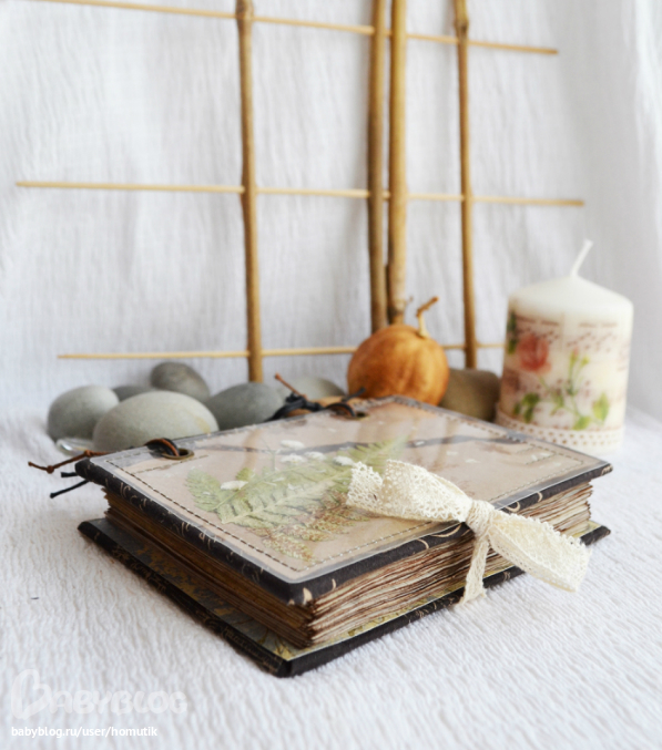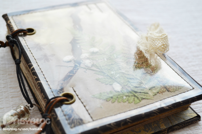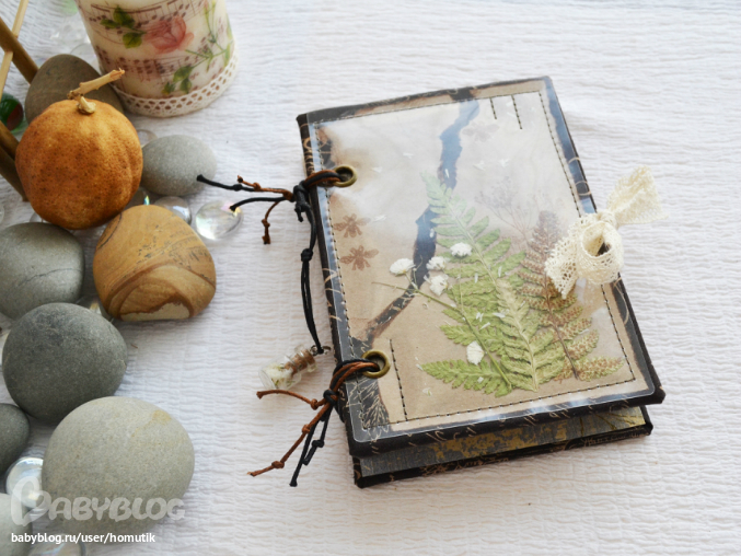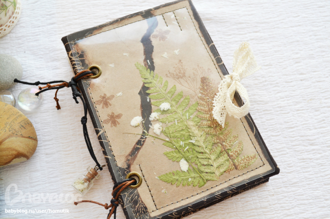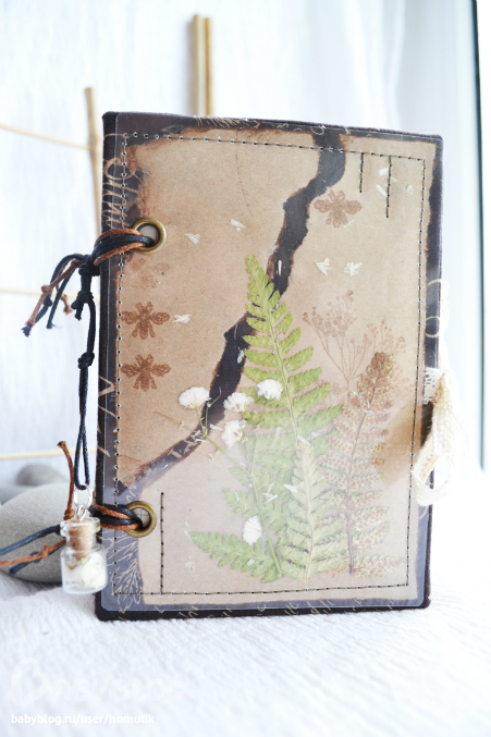 СкрапбукингНебольшой отсыл к двум моим прошлым работам, объединила их в одном блокноте. Под пластиковой пленкой сухоцветы папоротника и гипсофил. Около 200 страниц, точно не считала, сбилась)) Крепление - шнуровка, на блокноте есть подвеска - стеклянная баночка с цветками гипсофил. А, да, листочки в клеточку, тонированы кофе.