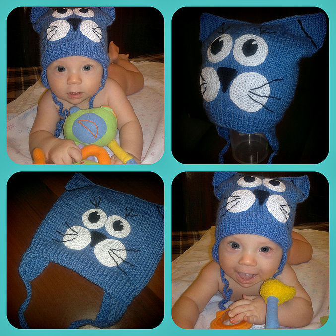Лена а ты тоже такую вязала. Я хотела как у тебя, но получилось совсем по другому. Я резинку провязала и на завязках сделала, чтоб шапка держалась хорошо. И крючком мордаху вывязала, а тоже сначала хотела как у тебя сделать.