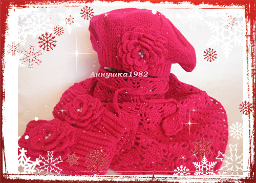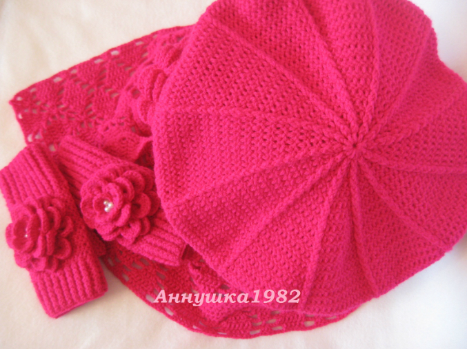 Комплект берет+бактус+митенки связался для старшей дочки. Модель берета, бактуса и цвет пряжи она выбирала сама.