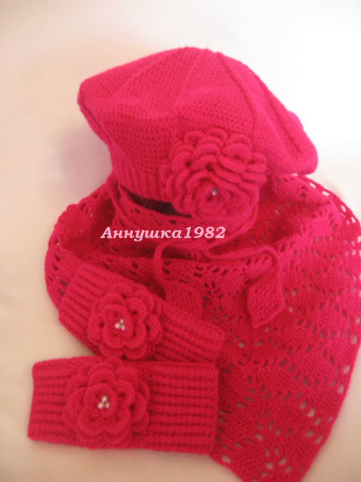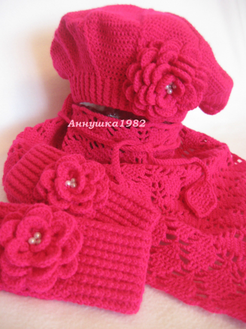 На весь комплет ушло почти 5 моточков Ярн Арнт беби акрил. Крючок №2,5. Цвет пряжи малиновый, хотя на фото он какой то ядовитый
