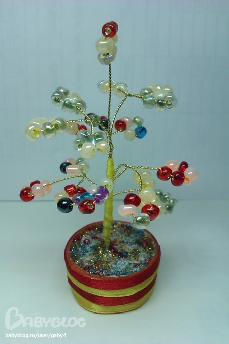 Повторюсь: подбор цвета - дело Лизочкиных ручек, веточки тоже нанизывала она... я только скрутила и довела до ума, вот!))) Горшочек - из крышечки от минералки, ленточками задекорированный...
