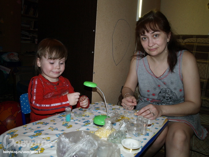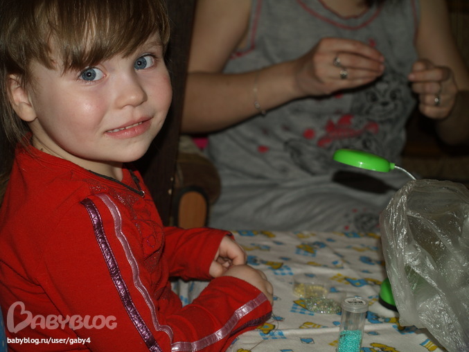 Подбирала цвет сама Лизочка, правда, на первый раз, я всучила ей бисер большого диаметра, чтоб сразу охоту не отбить)))