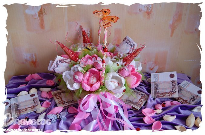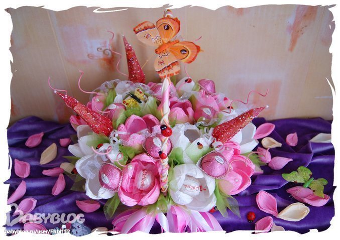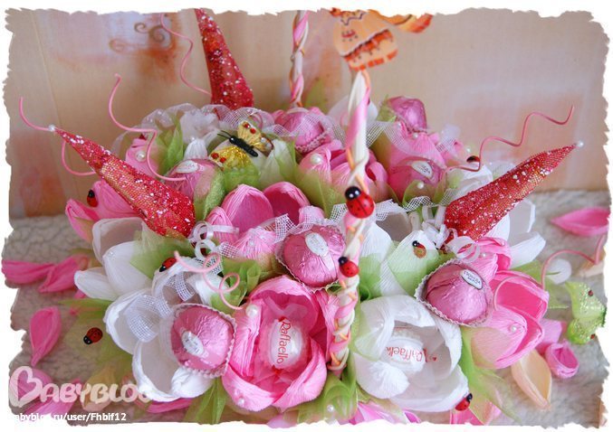 Сладкие букеты - это прекрасный оригинальный подарок который порадует представительницу прекрасного пола любого возраста. В этом букете 15 цветков из конфет рафаэлло + конфеты Вкус победы и 3 конфеты Konafetto крем-сгущенное молоко!Конфеты можно любые пожеланию клиента.Цена 1300р.Изготовлю 2-3 дня