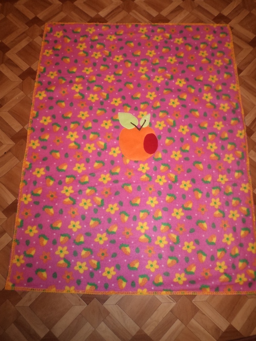 Сложила 1 метр флиса пополам,вышло одеялко 85Х100. по краю пристрочила пунктирным зиг-загом тесьму с обеих сторон. Аппликацию вырезала и кусочков флиса,посаженных на флизелин.Пристрочила трикотажной строчкой.