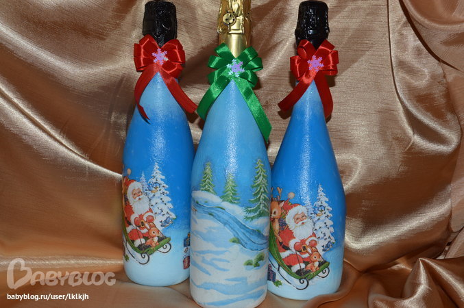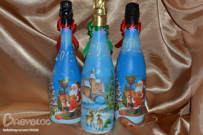 ДекупажВообще-то, это третья моя работа в декупаже, а бутылочки первые. Так на Новый год захотелось сделать бутылочки, попробовала и... сделала еще две на подарки. Сказать, что понравилось - ничего не сказать. Для меня самое непонятное было подобрать фон под салфетку. Но, справилась. Когда держишь такую красоту в руках - прямо распирает от гордости.