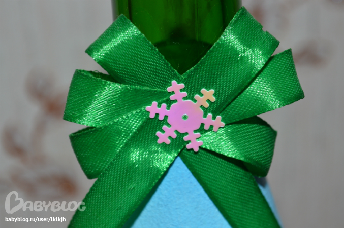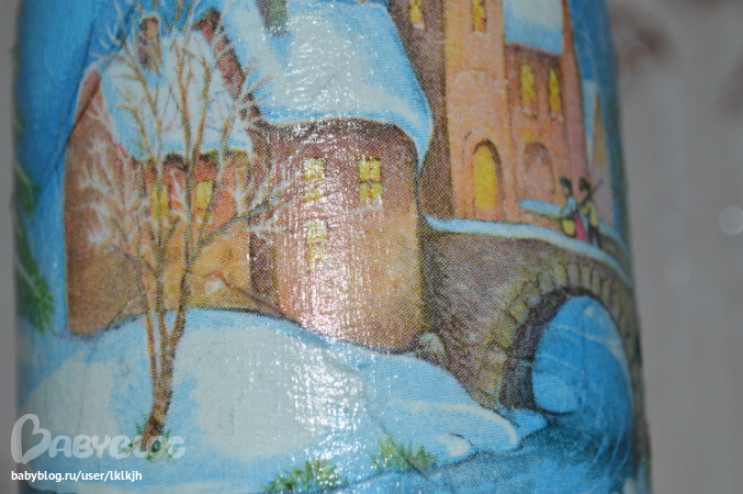 Под самой салфеткой грунт естественно - белая акриловая краска. А вот около салфетки нужно было подкрасить фон, чтоб переход от салфетки к фону бутылки был незаметен - вот это было самое сложное для меня. Я смешивала синюю акриловую краску с белой до нужного оттенка, пробовала мазок на бутылочке. Все мужа спрашивала - подходит? Для меня это хороший опыт. Хоть начало доходить, как получить нужный цвет. А то лежит досочка под гжель почти сделана, надо по краю подобрать цвет, уже помучилась - не получилось. Вот так!