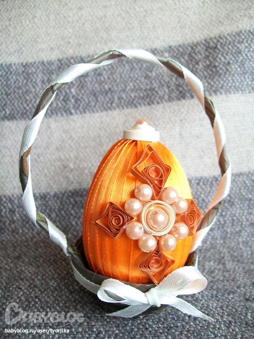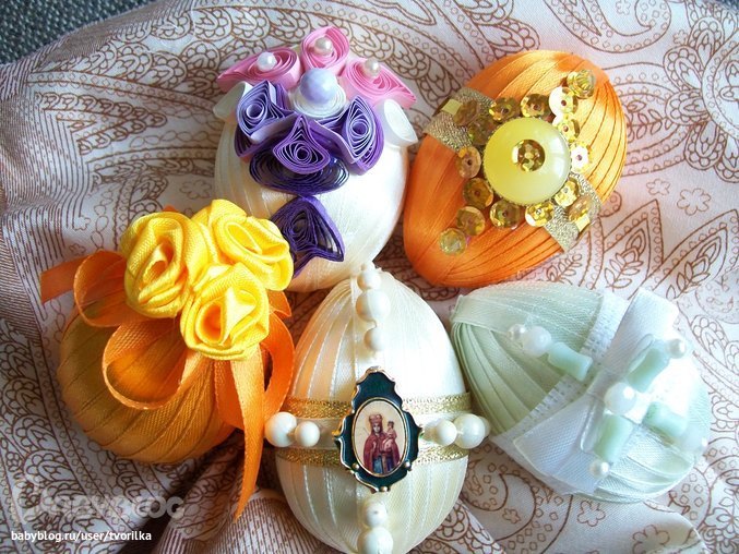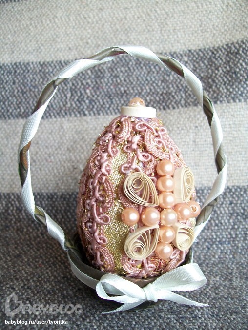 Использовала в декоре яиц много всего: паетки, бусины, ленты, канву, элементы квиллинга.