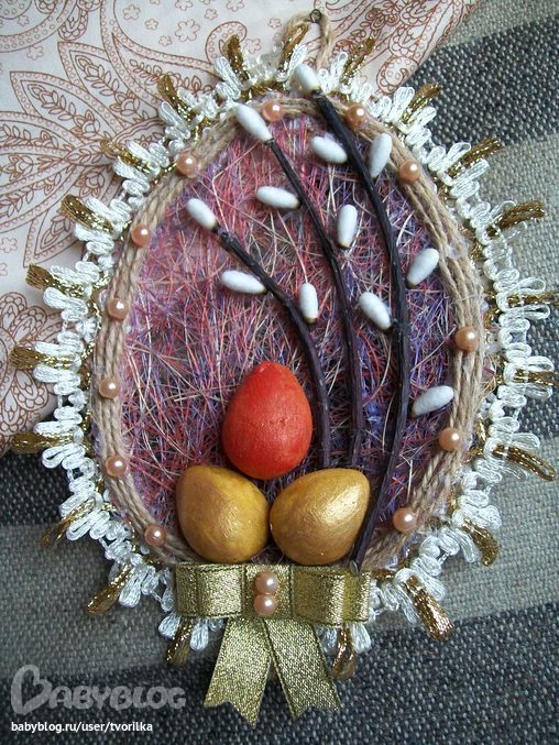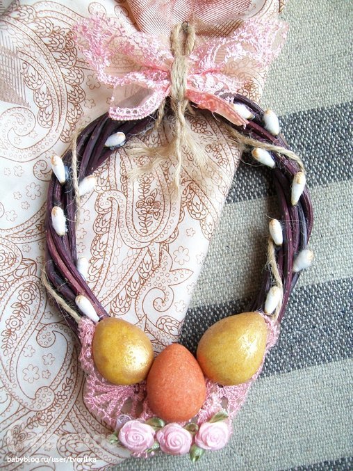Венки из настоящих веток, вербные почки - из ватных палочек, яйца - из соленого крашенного теста, еще немного кружева и розочек из атласных ленточек.