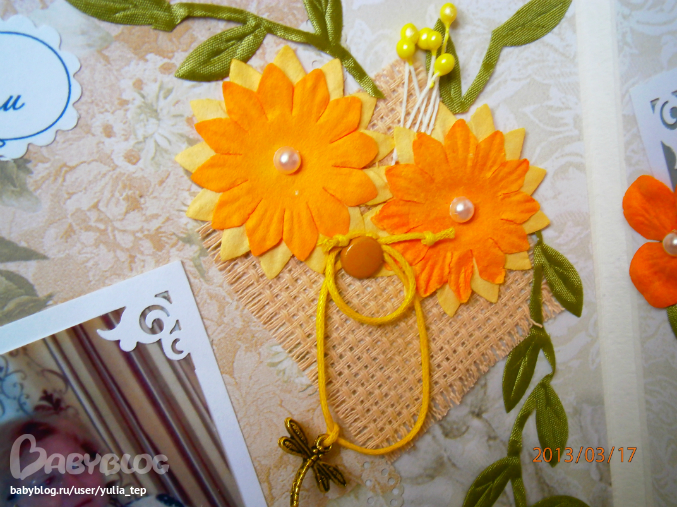 яркий пример 5ый и 6ой разворот - очень неожиданно по цветам украшений, но так как на обеих страницах разворота украшения в одной гамме - протеста не вызывает)) Я бы вот даже не подумала взять здесь оранжевый, моожет быть такая мысль и возникла бы у меня на пред развороте, где оранжевый бант и оранжевый стол, но на 5-ом точно нет, для меня это как-то слишком смело, но ты любишь яркие цвета, у тебя интересно получилось.