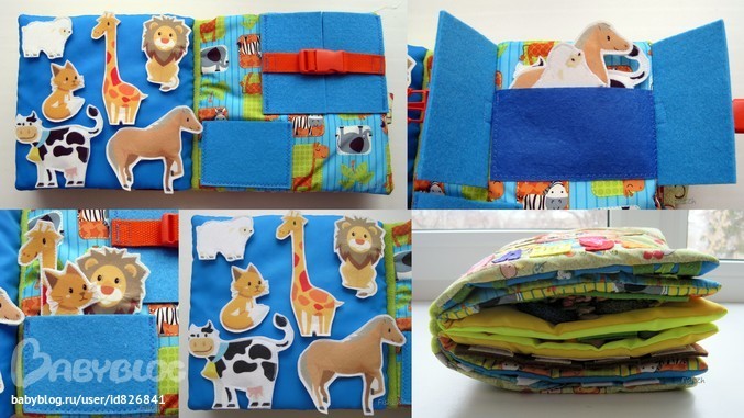 9,10 стр - странички с животными из фетра.Нужно животных разделить по группам на домашних и диких, спрятать их в кармашки.
