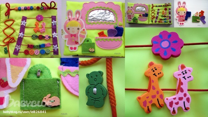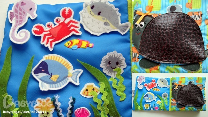1,2 стр - морские странички - рыбки на липучках, из фетра, некоторые звенят, шуршат."Водоросли" - ленточка "зиг-заг", фетр.Черепашка из иск. кожи, снизу кармашек на молнии, можно прятать рыбок внутрь.