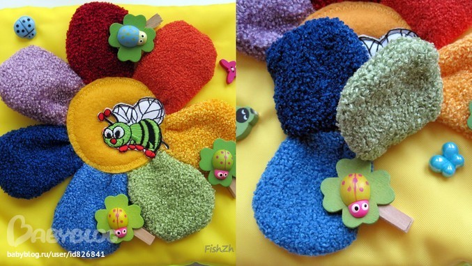 На 4 странице цветик-семицветик, внутри каждого лепесточка разный наполнитель: синтепон,бусинки мелкие, бубенчик маленький и большой, пищалка, пуговица, шуршащий пакетик. Божьи коровки на лепестках - прищепки.Под лепесточками прячутся бабочка и божья коровка (бусинки).