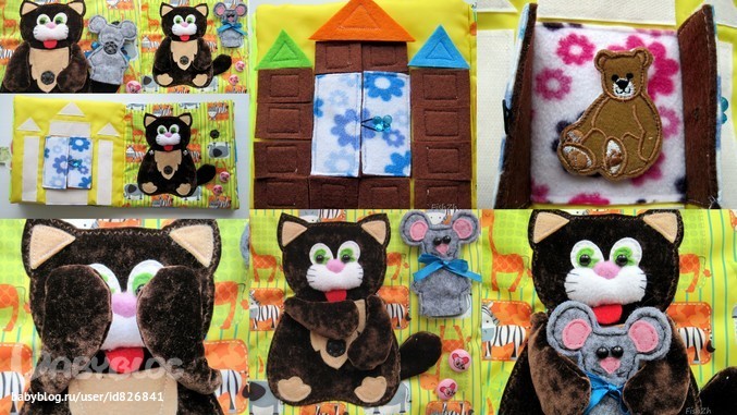 8 стр - кот из ткани, похожей на бархат/плюш, не знаю, как называется. Мышка из фетра, можно использовать в качестве пальчиковой игрушки. Лапки котика на кнопках, может закрывать глаза, поймать мышку.
