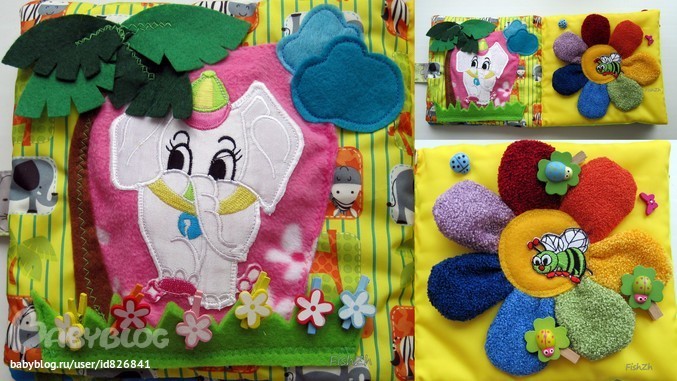 3 стр - слоненок-аппликация, внутри вшит механизм от музыкальной игрушки, читает стих, при необходимости можно отпороть низ аппликации и поменять батарейки. Цветочки - прищепки, также оч полезны для развития мелкой моторики.