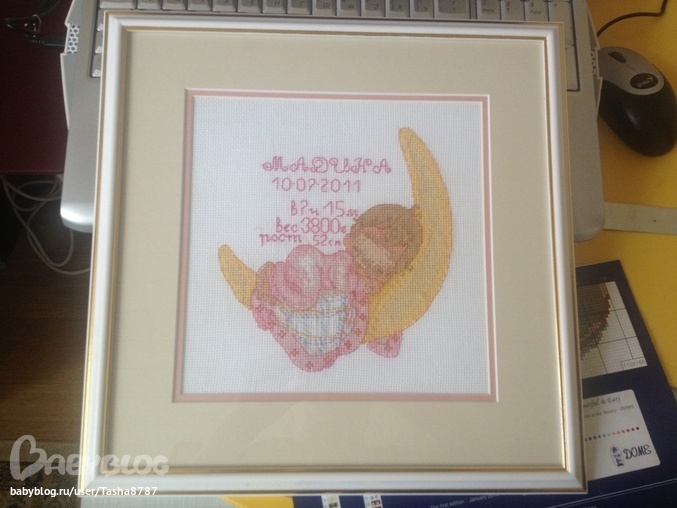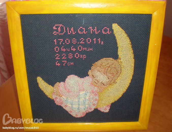 Я что-то не вижу, где вы задали вопрос. Я вам уже ответила, что нитки подобраны никак. Надпись впихнули в маленький квадратик. Я думаю, что друзья вам льстят, когда сказали, что вышивка им понравилась. А на вашем месте и бы вышила другую метрику и подарила вместо этой.