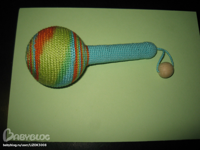 Какой замечательный подарок!!!! Я уже голову сломала, но так и не смогла додуматься, как будет пристроена погремушка))) Марина, получилось просто здорово!