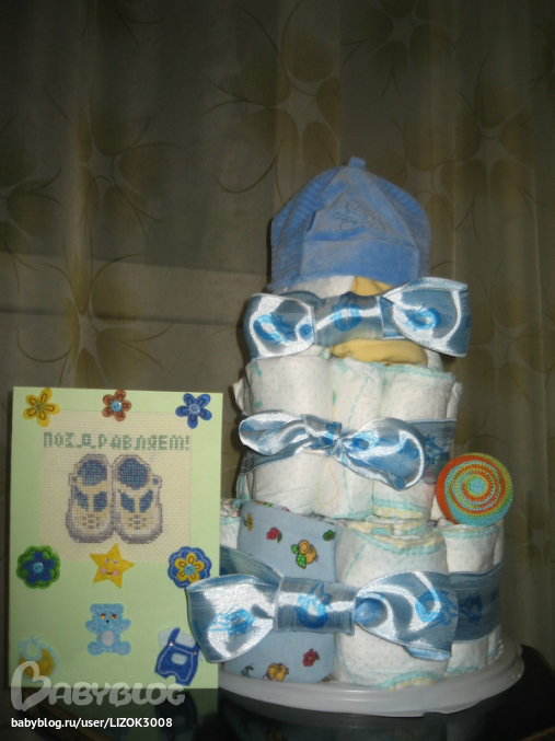 Скажу сразу пришлось повозиться. Тортик из памперсов , одежды,и игрушка ручной работы, и открытка ручной работы.