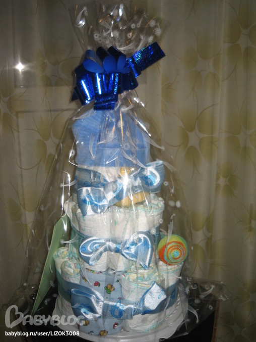 Очень удобно и аккуратно получается если каждый памперс завернуть отдельно в пищевую пленку, они тогда не раскручиваются и очень аккуратненько смотрятся, их легко соединитьи лентой связать, не страшно по пленке скотчем кое-где пройтись для устойчивости конструкции...