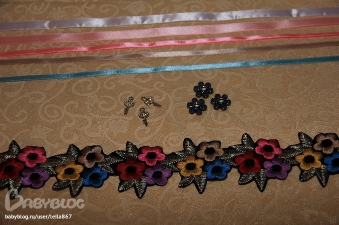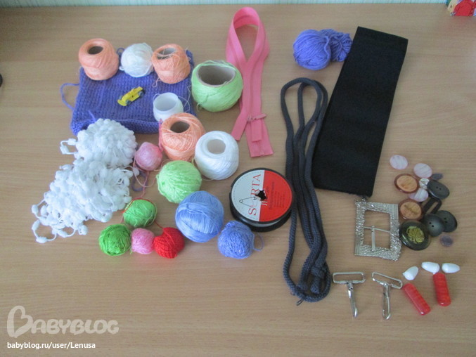 Остатки разных ниток, большая широкая резинка, молния розового цвета, толстый шнурок, леска, разные пуговки, карабинчики и пряжка.