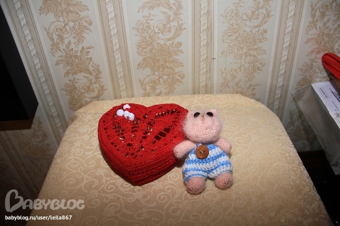 Шкатулка-сердце, связанная крючком, и котенок Персик. Набор атласных лент по 3 метра, немного декоративной ленты с цветами и 6 подвесочек.