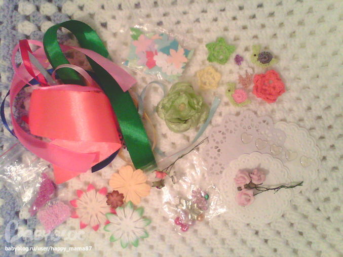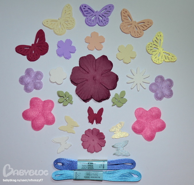 дырокольные цветочки по 6 шт каждого, дырокольные листики 20 шт, 4 фетровых цветика и атласные ленточки 6 мм.Для дырокольностей использовала бумагу для пастели, а для белого цвета-акварельную бумагу. Пожелаю выигравшего слоника, могу поменять некоторые цвета дырокольностей на другие.