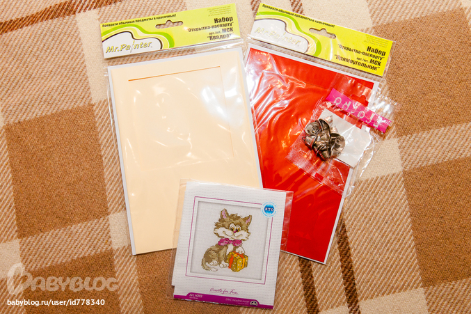 2 открытки-паспарту (кремовая - квадрат, красная - прямоугольник), вышивка, и колокольчики +СЮРПРИЗ-БИСКОРНЮ.