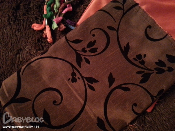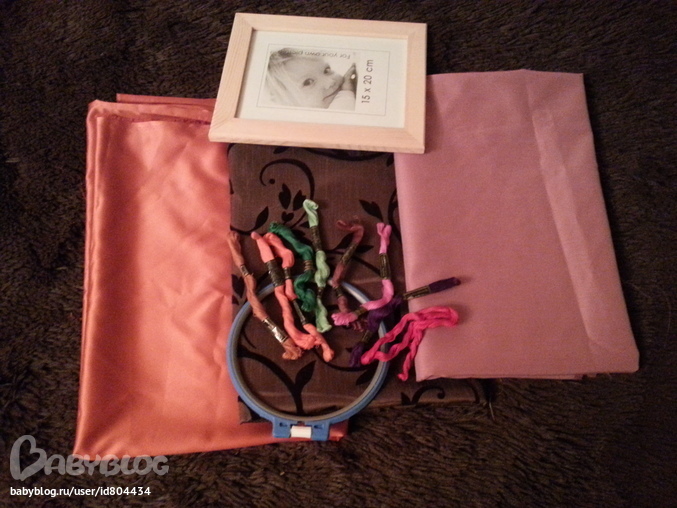 3 отреза ткани (1,7 длина и ширина где-то метр), 2 плотные, типа шторных, и одна атласная.рамочка деревянная, может для декупажа подойдет, нитки мулине, пяльца.
