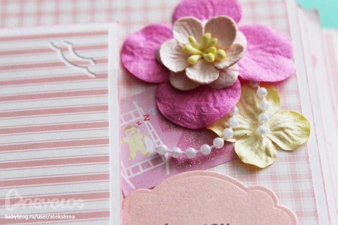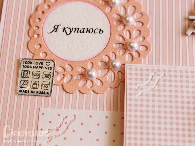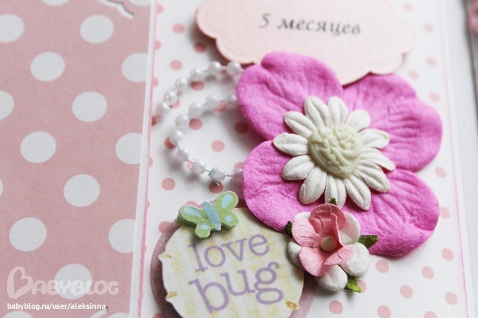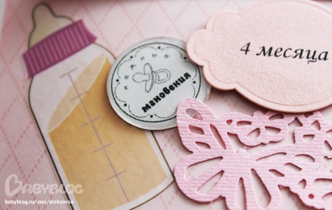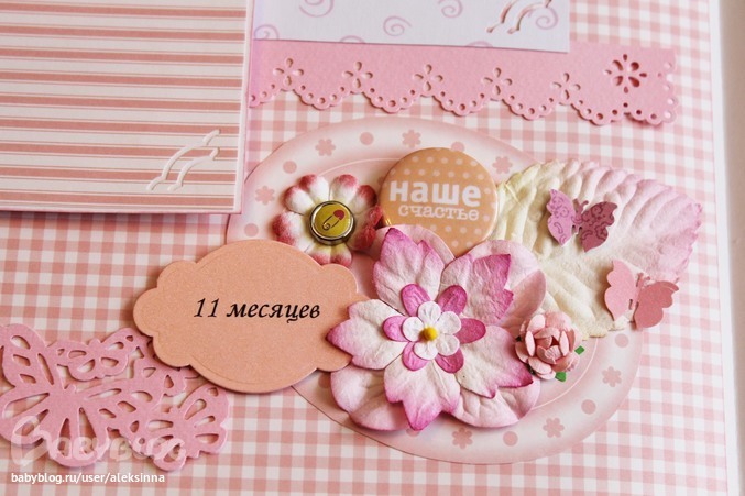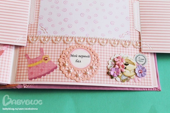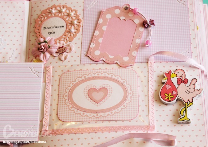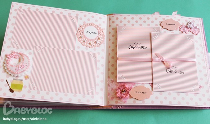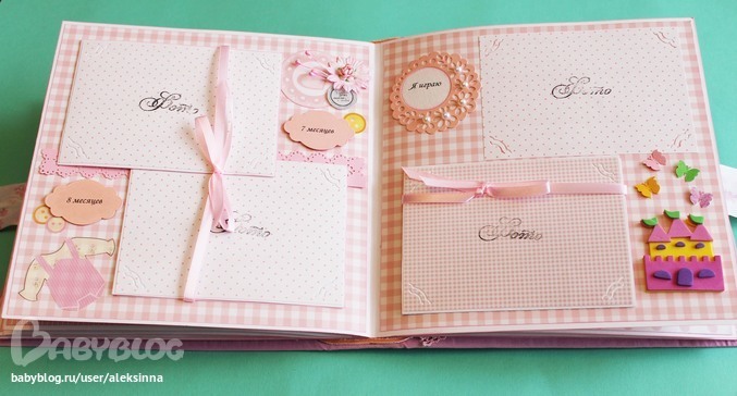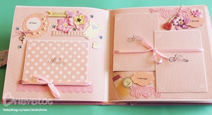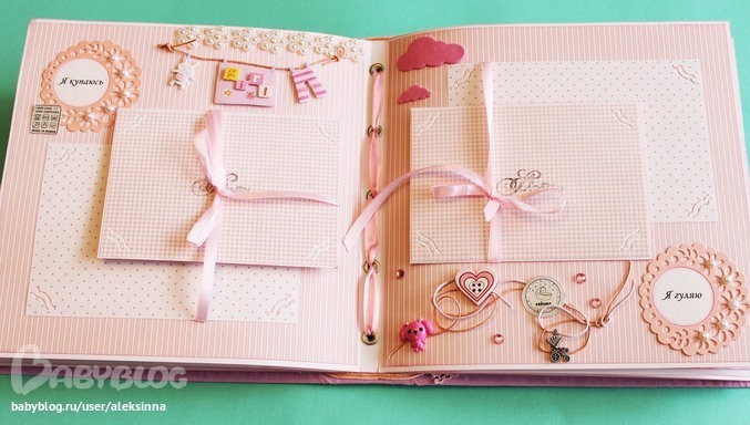 Альбом вмещает 61 фото (10х15 и 9х13) и +8 маленкие фото для коллажа.(7х7см). есть кармашек для снимка УЗИ и тег для тестика, в конце альбома - карман для таблицы Рост-Вес, для записи о достижениях малышки, а также для отпечатков ладошки и стопы малышки.
