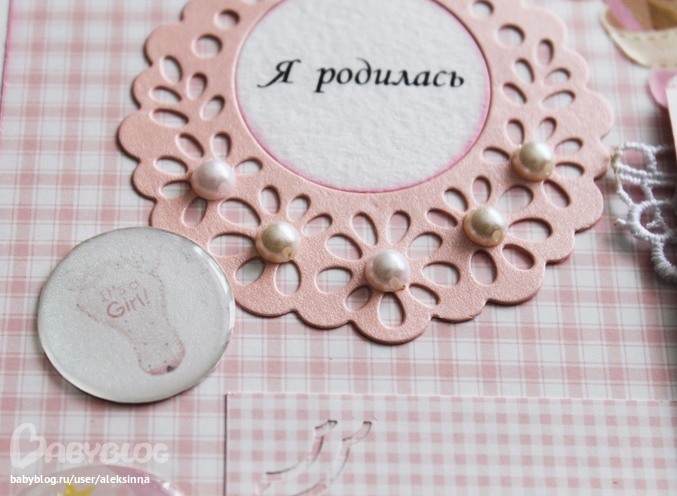 1 разворот: метрика малышки, ленты для бирки из роддома и "В ожидании чуда"