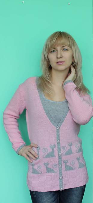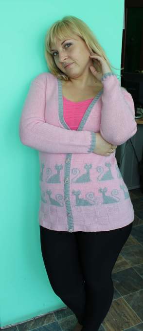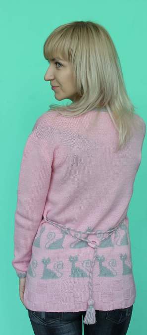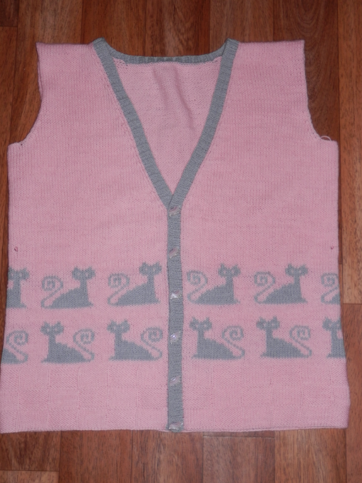 После второго ряда кошек, провязала 9 рядов лиц. гладью. В 10 ряду: 53 п. лиц, двойной накид, 2 вместе лиц вправо, 2 лиц, 2 вместе лиц влево, 2-ой накид, 112 лиц, 2-ой накид, 2 вместе лиц вправо, 2 лиц, 2 вместе лиц влево, 2-ой накид, 53 п.лиц. 11 ряд все петли изнаночными, в том числе накиды. Далее лиц. гладь. Получились дырочки по бокам - для поясочка.