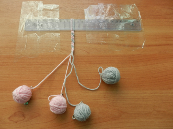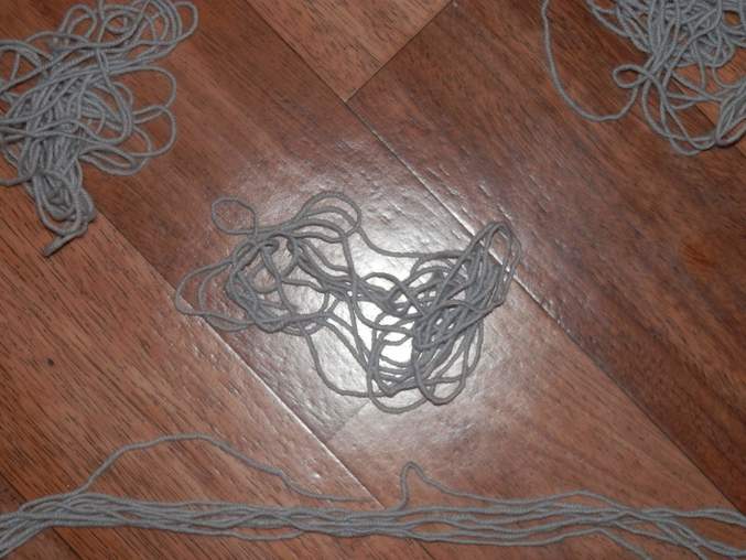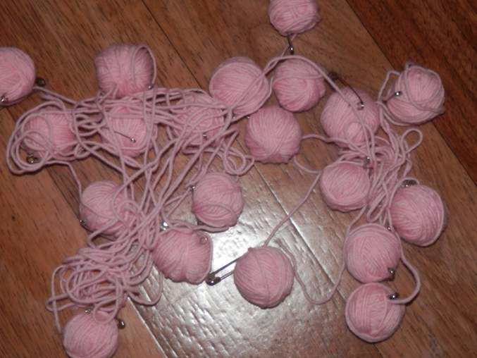 1 кошка - 19 п. + 4 п. между кошками = 23 п. ( отсюда и набор петель 230 п., т.е. на 10 кошек). Для исключения протяжет, каждая кошка - отдельный моточек. Для этого наматываем 10 моточков серого цвета, и 10 моточков розового.