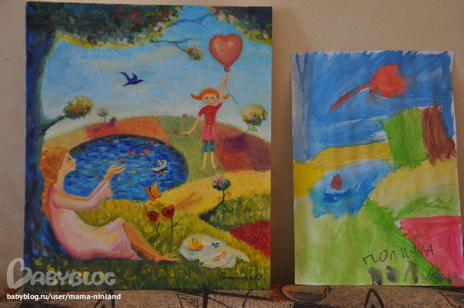 дочка, увидев картину, очень удивилась, восхитилась (как и муж, ему тоже очень понравилось!) и решила в тот же вечер написать продолжение картины, сказав: "Я тоже буду такой художницей, когда вырасту!" и вот что она нарисовала:
