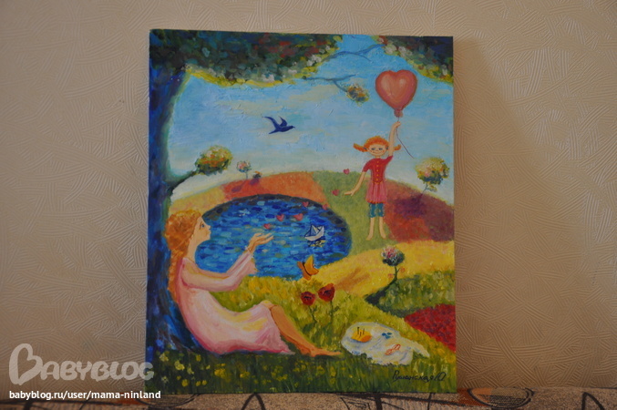 Так получилось, что я давно представляла себе эту картину. Молодую Девушку и Куколку, Солнце, Зелень, Деревья, Цветы, Птички-Бабочки! и когда я увидела Юлину картину первый раз (розовый слоник на качелях http://www.babyblog.ru/community/post/rukodelie/1818551 - предложила Юле обменяться и описала свою мечту, она через несколько минут показала мне фото уже готового эскиза. Это была заготовка этой самой картины, только вместо куколки был зайчик на шаре)) представляете??!!) то есть идея Юлина гармонично совпала с моей! Провидение, не иначе!!