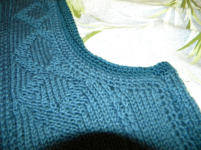 На высоте 56 см начинаем вывязывать V-образный вырез горловины.