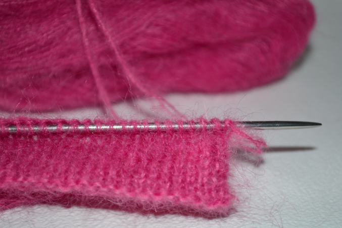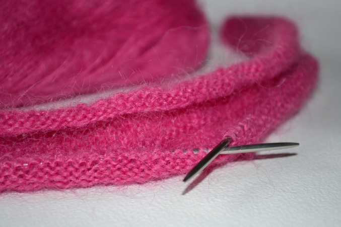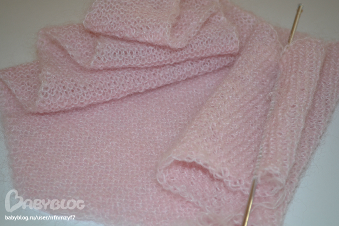 Теперь измерения производятся от этой части.Перейти на спицы 4 мм и вязать двойной нитью платочной вязкой.