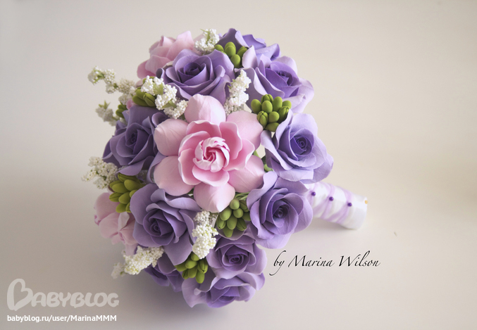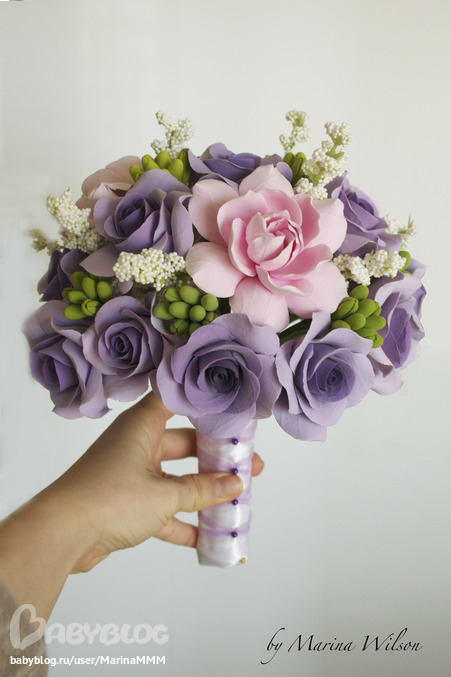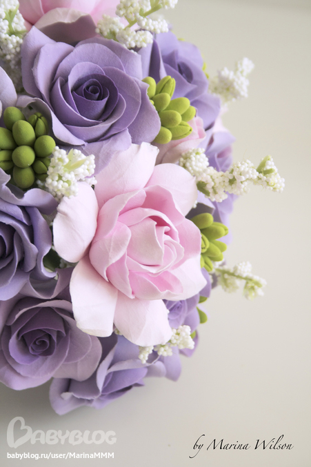 Вообще я удивилась, тому что вышло.. так мне в начале не нравились эти фиолетовые розы (я не любитель этого цвета)... но как-то я их увидела рядом с розовыми, только что сделанными гардениями - и так они свеженько смотрелись в их сообществе.. что тут же было решено их поженить.. ну и собственно, что из этого вышло))