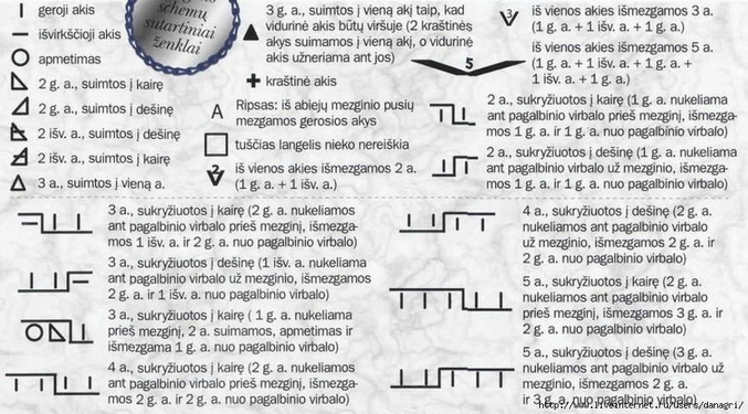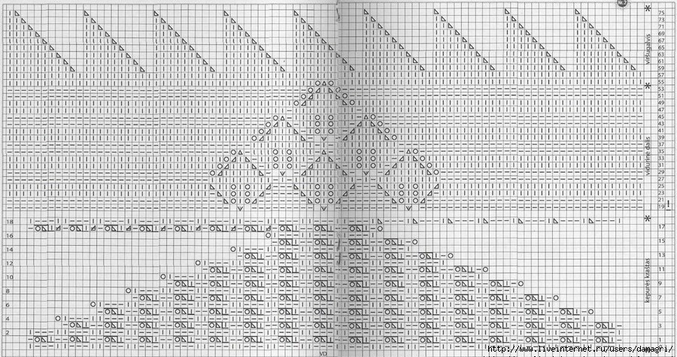 резинка - это укороченные ряды, ее вязала не как в схеме, а 2 изн потом сначала лицевую вторую и не снимая со спицы первую, затем снять одновременно, изнаночный ряд по рисунку. Дальше: - изн. петля, I лицевая, 0 - накид, v c I это из одной вывязать 3 петли, треугольни с углом 90 гр в право это две вместе лицевой за верхние дольки с уклоном вправо, а с угом 90 гр. влево- это две вместе за нижние (задние дольки). просто треугольник- это три вместе, средняя сверху. Еще есть треугольник с прямым углом и черточкой это две вместе изнаночной! вроде все. если что непонятно, спрашивайте!