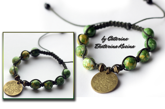 Бижутерия для слингомам. Слингобусы. Грызунки.Дождевой камень (Аргентина) браслет шамбала на вощенном шнуре темнозеленного цвета.10 мм бусинки фурнитура под бронзу, медальон.
