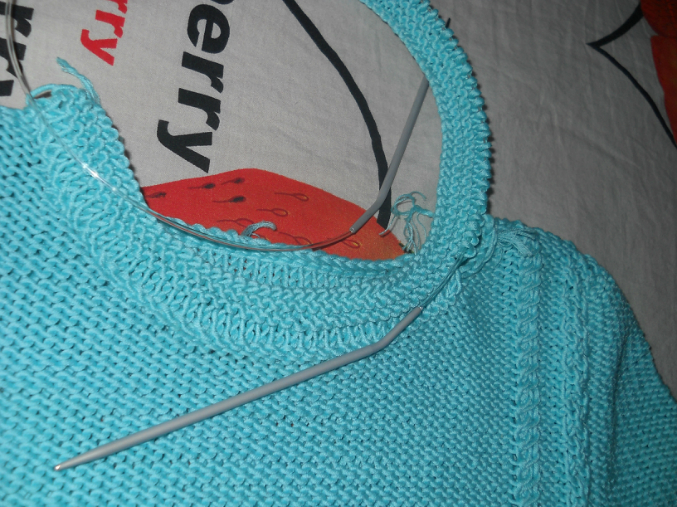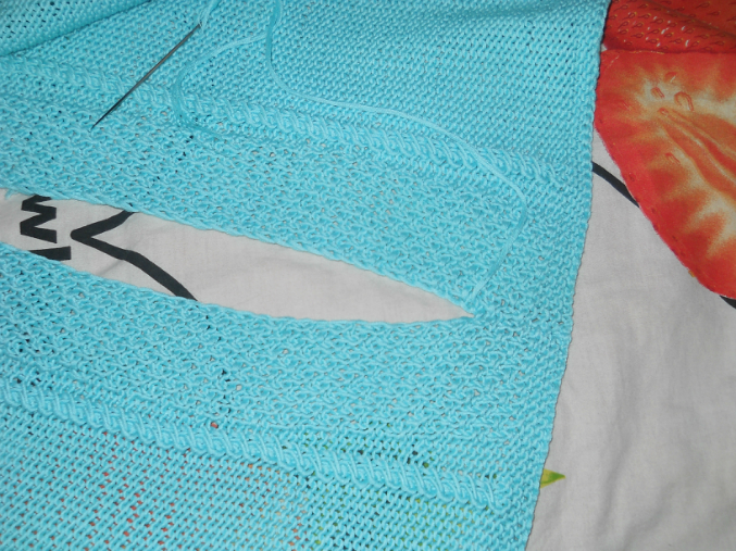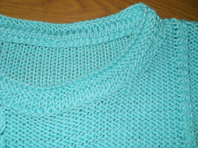 Горловину связала отдельно. Набрала на спицы №2,5 110 петель, связала 4 ряда платочной вязкой. Затем перешла на спицы №3,5 и связала еще 4 ряда лицевой гладью. В конце петли не закрывала и прикеттлевала. Намучалась капитально.)))