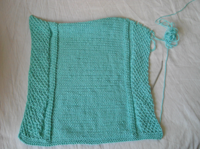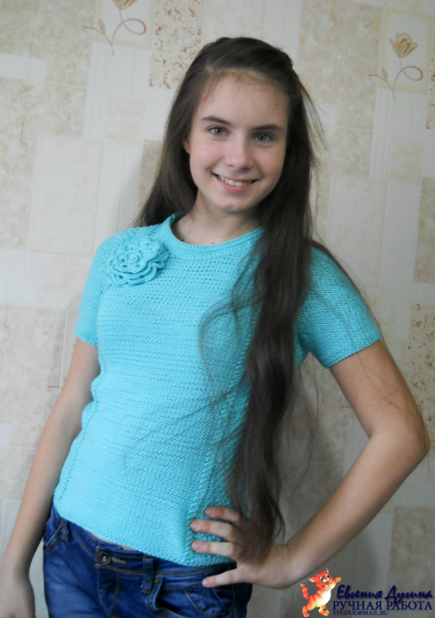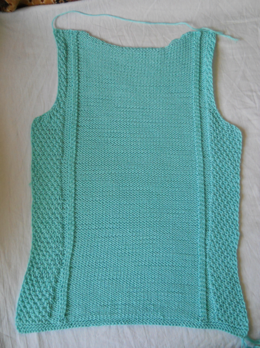 все получилось, как всегда) А именно - я распустила то, что было и начала заново. Начинала вязать в две нити - получилось как-то грубовато. Представила, что летом носить эту рогожку будет и вовсе неприятно, поэтому начала вязать в одну нить. Рисунок тот же, только петель набрала побольше, а спицы вязала поменьше)))) Что из этого получилось, судите сами.