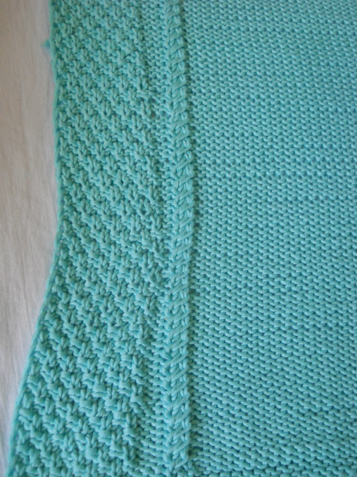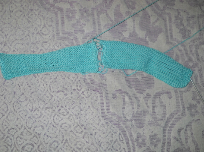 Набрать на спицы №2,5 46 петель. Вязать 6 рядов платочной вязкой. Затем перейти на спицы №3,5 вязать 12 рядов изнаночной гладью. Затем для оката рукава закрыть с двух сторон по 3 петли, затем в следующем 2-м ряду убавить по 2 петли, затем в каждом 4-м ряду 9 раз по 1 петле. в след. 2 ряду закрыть оставшиеся 18 петель.