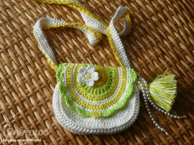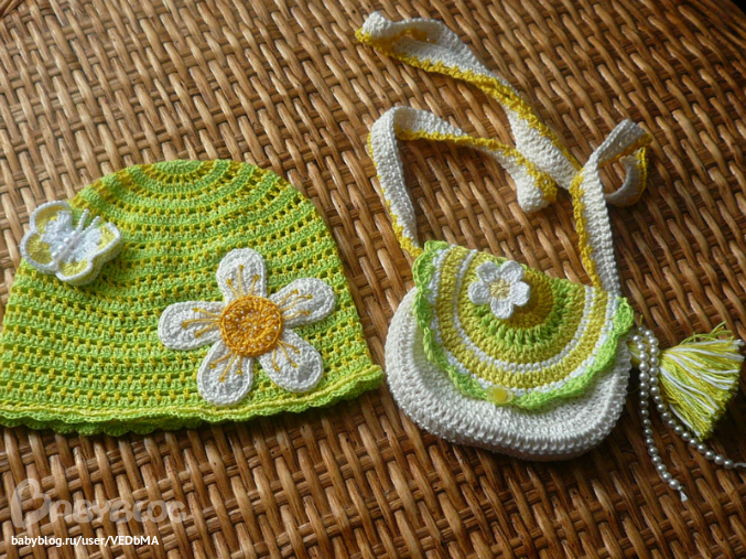 Следующий комплект по мотивам Вендулы. Связан на заказ для двухлетней красотки. От сумочек ее я просто балдею. Но это у меня из детства, когда-то давно мне бабушка вязала маленькие ажурные сумочки и кармашки под носовой платок.